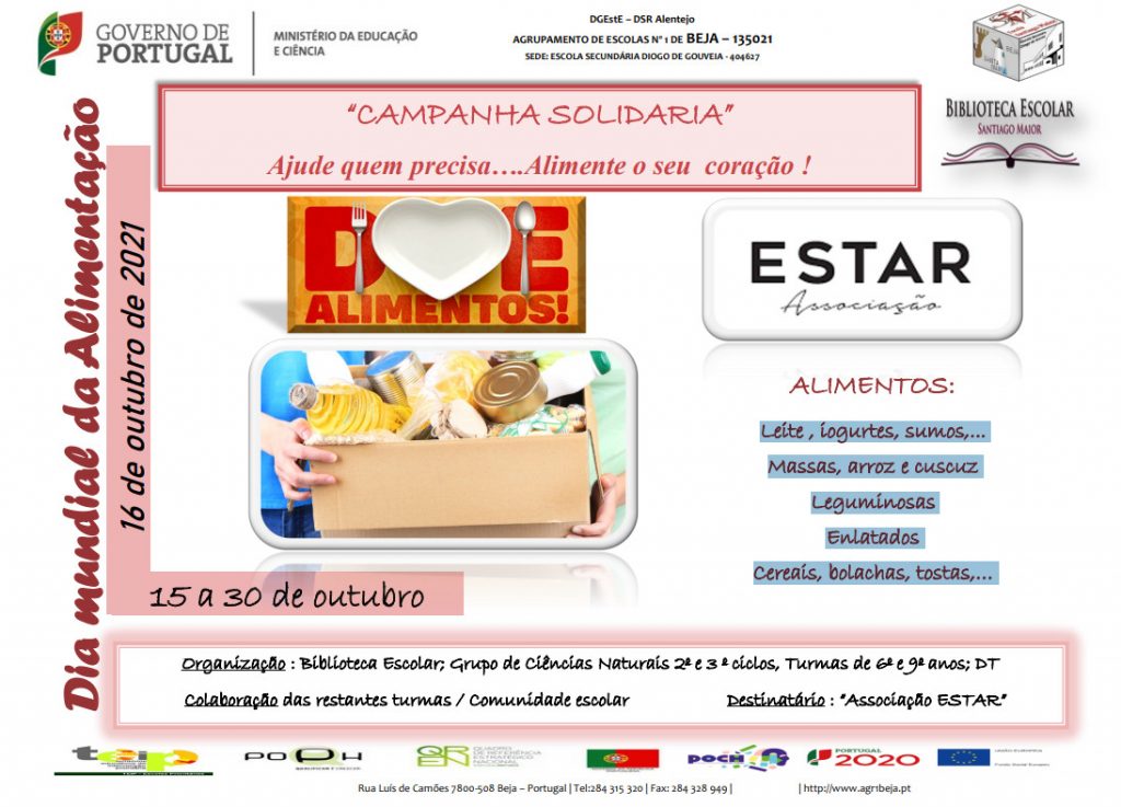No âmbito do Dia Mundial da Alimentação, e em colaboração com a biblioteca escolar da Escola Básica de Santiago Maior, o grupo de Ciências Naturais do 2º e 3º ciclos com a participação dos alunos do 6º e do 9º anos, promove a campanha solidária de recolha de alimentos para ser doada à Associação “ESTAR”. A campanha decorre entre 15 a 30 de outubro. Podem ser doados os seguintes alimentos: leite , iogurtes, sumos, massas, arroz, cuscuz, leguminosas, enlatados, cereais, bolachas, etc.
