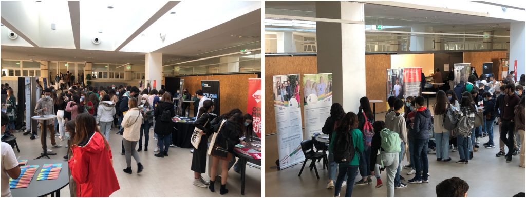 No pátio da escola estiveram instalados pequenos stands informativos com as ofertas de ensino superior português. Os expositores foram visitados pelas turmas do ensino secundário, e os alunos tiveram a possibilidade de recolher informação preciosa, sobre universidades, cursos e apoios. Às 8:15h realizaram-se duas sessões para as turmas de 12º ano, sobre o acesso ao ensino superior, onde, através de uma linguagem simples e dinâmica os técnicos explicaram como funcionam as candidaturas.
