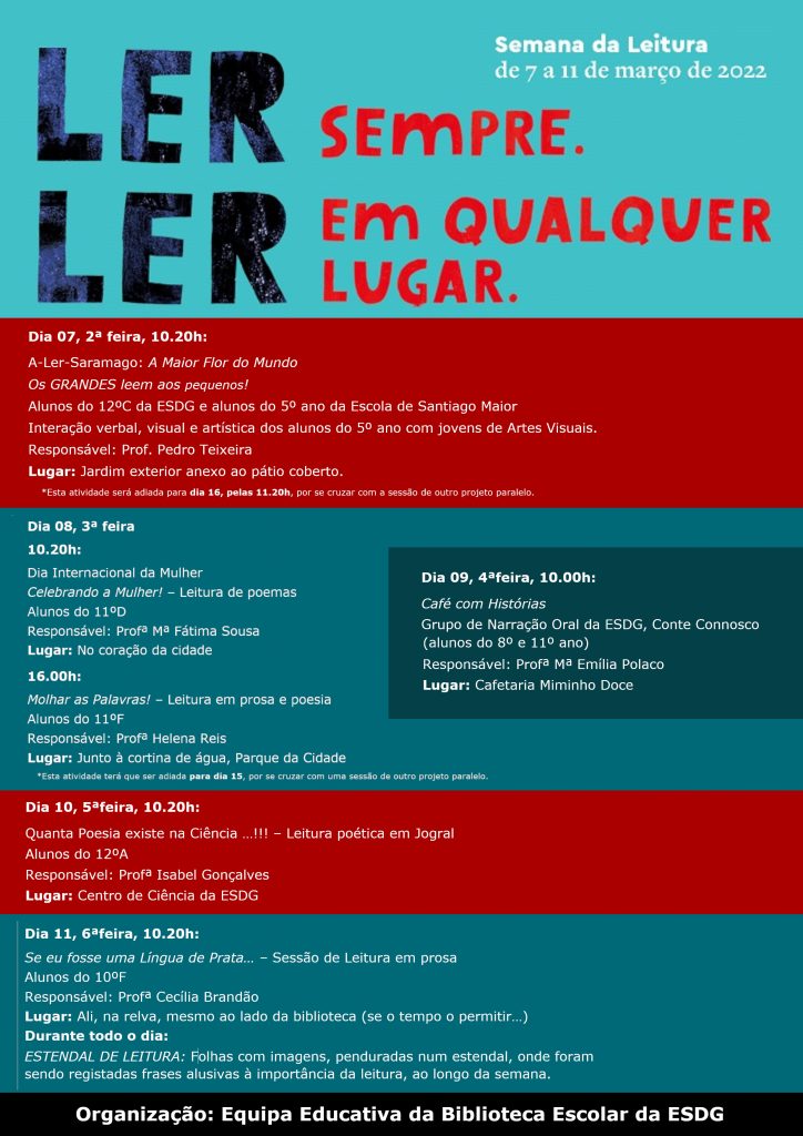 Programa oficial da “Semana da Leitura 2022” na Escola Secundária Diogo de Gouveia. Para informações adicionais poderá contactar a equipa educativa da biblioteca escolar da Escola Secundária Diogo de Gouveia.