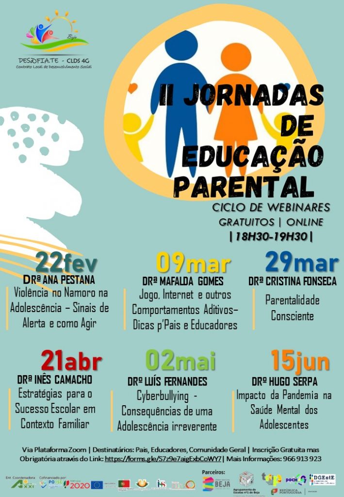 É já no dia 9 de Março, que se realiza o 2º Webinar integrado nas II Jornadas da Educação Parental, dinamizadas pelo Projeto Desafia.te CLDS 4G Beja, em parceria com o Agrupamento de Escolas n.1 de Beja. Teremos todo o gosto em contar consigo nesta ação conjunta, em que iremos no dia de amanhã, debater a Temática “Jogo, Internet e outros Comportamentos Aditivos – Dicas para Pais e Educadores”, para tal contamos com experiência da Dra Mafalda Gomes Figueiredo.
