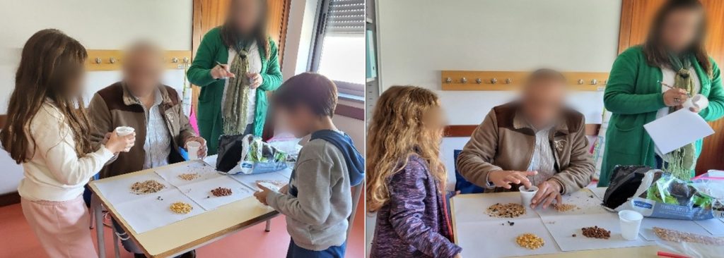 A seguir, todos os alunos puderam escolher uma semente para colocar num copinho com terra e água. Observaram ainda algumas sementes e verificaram que elas podem ter diferentes formas, cores e tamanhos. Por fim, ainda aprenderam e mimaram a canção: “Semente, sementinha”.